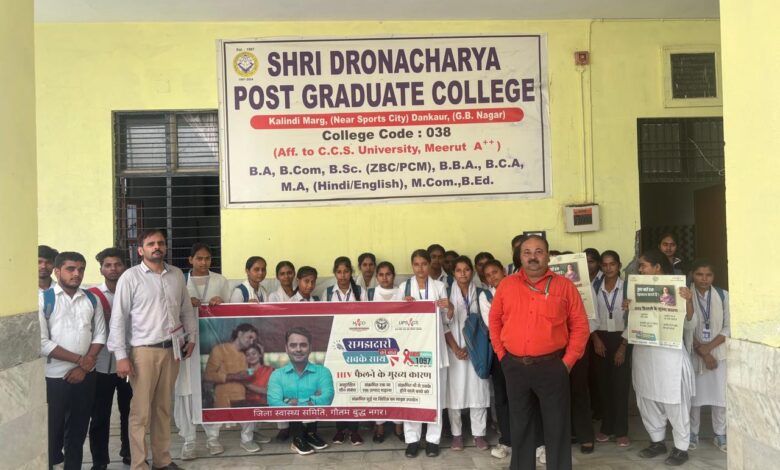 दनकौर:आज श्री द्रोणाचार्य पी जी कॉलेज, दनकौर गौतमबुद्ध नगर, उत्तर प्रदेश एवं जिला स्वास्थ्य समिति, गौतम बुद्ध नगर के संयुक्त तत्वाधान में “HIV & AIDS पर एक जागरुकता कार्यक्रम सफलतापूर्वक आयोजित किया गया , जिसका संयोजन डॉ0 अनुज कुमार भड़ाना के द्वारा महाविद्यालय सचिव रजनीकान्त अग्रवाल  एवं प्राचार्य डॉ . गिरीश कुमार वत्स के संरक्षण में किया गया। राजकीय मेडिकल कॉलेज एवं अस्पताल जिम्स कासना से आए डॉ नवनीत कुमार के द्वारा HIV & AIDS पर एक विशिष्ट और सुसंगठित व्याख्यान प्रस्तुत किया गया, जिसमें छात्रों को जागरूक करने और अपने आसपास के माहौल में जागरूकता फैलाने पर बल दिया गया। साथ ही उन्होंने गौतम बुद्ध नगर में प्रवासी लोगों की आवाजाही के कारण एचआईवी एड्स के मरीजों में हो रही वृद्धि के संदर्भ में भी चिंता व्यक्त की। वहीं दूसरी ओर उन्होंने छात्र छात्राओं की जिज्ञासा को शांत करते हुए उनके प्रश्नों का स्पष्ट जवाब दिया।