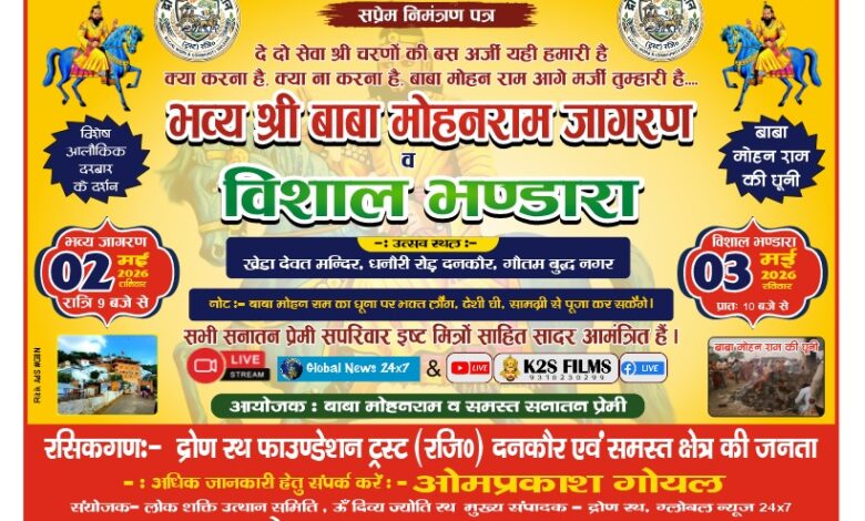 दनकौर : इस वर्ष गौतमबुद्धनगर के दनकौर क्षेत्र में आगामी 2 एवं 3 मई 2026 को आस्था, भक्ति और लोक-परंपरा का अद्भुत संगम देखने को मिलेगा। प्राचीन ऐतिहासिक खेड़ा देवत मंदिर, धनौरी रोड, दनकौर में द्रोण रथ फाउंडेशन द्वारा क्षेत्रीय श्रद्धालुओं के सहयोग से भव्य श्री बाबा मोहन राम जागरण एवं विशाल भंडारे का आयोजन किया जा रहा है।