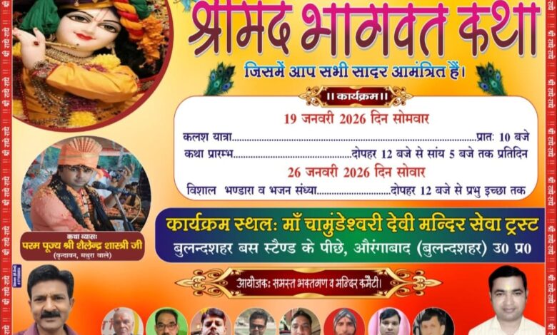 औरंगाबाद (बुलंदशहर ) चामुंडा मंदिर परिसर में भागवत कथा महोत्सव सोमवार से कलश यात्रा के साथ शुरू होगा। समापन 26 जनवरी को भंडारे के साथ किया जायेगा।