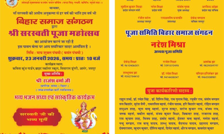 जयपुर : बिहार समाज संगठन जयपुर जिला की ओर से आज बसंत पंचमी पर माँ सरस्वती की पूजा अर्चना किया जाएगा । आज सुबह मूर्ति स्थापन 10:00 बजे होगी । दोपहर 12:30 बजे से प्रसाद वितरण होगा ।इसके बाद भजन कीर्तन होगा जो रात तक होगी । समाज के मिडिया प्रभारी सुरेश पंडित ने बताया कि यह कार्यक्रम कविता कुंज गार्डन, ब्राइट सकॉलर स्कूल , सियाराम डुंगरी , आमेर पर बसंत पंचमी मनाया जाएगा । पूजा समिति के अध्यक्ष नरेश मिश्रा होंगे। इस वर्ष भी विद्या की देवी माता सरस्वती की पूजा अर्चना बड़ी धूमधाम से मनाया जाएगा ।मुख्य अतिथि राजेश वर्मा, खगड़िया सांसद, लोकजनशक्ति पार्टी रामविलास, बिहार होंगे । राष्ट्रीय अध्यक्ष पवन कुमार शर्मा, राष्ट्रीय महामंत्री चंदन कुमार मंडल और