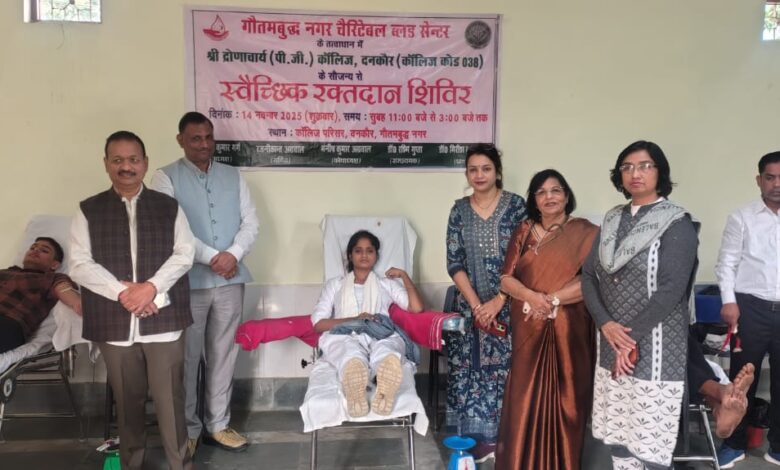 दनकौर:आज श्री द्रोणाचार्य (पी0जी0) काॅलिज, दनकौर, गौतम बुद्ध नगर में गौतम बुद्ध नगर चैरिटेबिल ब्लड सेन्टर, गौतम बुद्ध नगर एवम् महाविद्यालय की ओर से कार्यक्रम समन्वयक उपप्राचार्या डॉ .रश्मि गुप्ता द्वारा रक्तदान शिविर का आयोजन महाविद्यालय के सचिव रजनीकान्त अग्रवाल एवं प्राचार्य डॉ0 गिरीश कुमार वत्स के दिशा-निर्देशन में किया गया जिसमें महाविद्यालय के छात्र/छात्राओं एवं महाविद्यालय के स्टॉफ द्वारा रक्तदान किया गया। रक्तदान शिविर में डॉ0 अनीता गुप्ता मेडिकल डायरेक्टर), धीरज कुमार (सी0टी0ओ0), अंशु कुमारी (तकनीशियन), अभिषेक कुमार (तकनीशियन), रोहन कुमार, मृदुल कुमार, शिवा आदि टीम ने सहयोग दिया।