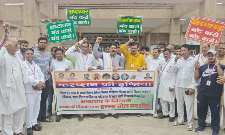 करप्शन फ्री इंडिया संगठन के संस्थापक चौधरी प्रवीण भारतीय व मा.दिनेश नागर ने बताया कि गौतम बुद्ध नगर में खाद्य विभाग के अधिकारियों की घोर लापरवाही एवं भ्रष्टाचार के कारण दबाकर नकली घी पनीर एवं अन्य खाद्य सामग्री बेची जा रही है। उन्होंने बताया कि सरकारी स्कूलों व अस्पतालों की स्थिति ठीक नहीं है प्राइवेट स्कूल,अस्पताल दबाकर लूट कर रहे हैं। चौधरी प्रवीण भारतीय ने कहा कि बिल्डर लंबे समय से लगातार भू-जल दोहन कर रहे हैं शिकायत करने के बाद भी अधिकारी के कार्रवाई नहीं करतें, जिलाध्यक्ष प्रेम प्रधान ने कहा कि आबकारी विभाग की घोर लापरवाही के कारण सरकारी शराब की दुकानों पर निर्धारित मूल्य से अधिक शराब बेचीं जा रही है। जनपद में जगह-जगह खनन माफिया सरकारी जमीन में रात दिन खनन कर रहे हैं चौधरी प्रवीण भारतीय ने बताया कि जनपद में नोएडा ग्रेटर नोएडा एवं यमुना प्राधिकरण के अंतर्गत आने वाले गांव एवं 80 ग्राम पंचायत के अधीन गांव अपने विकास की बाट देख रहे हैं। ग्रामीणों को कीचड़ युक्त रास्तों से गुजरना पड़ता है श्मशान घाट जैसी मूलभूत सुविधाएं नहीं हैं। उन्होंने बताया कि इन सभी विभागों में बढ़ते हुए लापरवाह रवैया एवं भ्रष्टाचार पर तत्काल अंकुश लगाने की मांग करते हुए संगठन के सैकड़ो कार्यकर्ताओं ने जबरदस्त प्रदर्शन किया।