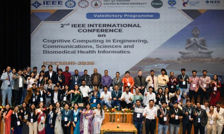 ग्रेटर नोएडा:गौतम बुद्ध विश्वविद्यालय (जीबीयू), ग्रेटर नोएडा ने कॉग्निटिव कंप्यूटिंग इन इंजीनियरिंग, कम्युनिकेशन्स, साइंसेज, एंव बायोमेडिकल हेल्थ इन्फॉर्मेटिक्स (IC3ECSBHI-2026) पर द्वितीय आई.ई.ई.ई. इंटरनेशनल कॉन्फ्रेंस का आयोजन किया, जो एक तीन दिवसीय अंतरराष्ट्रीय आयोजन था जिसमें दुनिया भर के शिक्षाविदों, शोधकर्ताओं, वैज्ञानिकों, स्वास्थ्य पेशेवरों और उद्योग विशेषज्ञों को एक साथ लाया गया। माननीय कुलपति प्रो. राणा प्रताप सिंह के मार्गदर्शन में, सम्मेलन में 250 से अधिक शोध पत्र और 50+ पोस्टर पत्र प्रस्तुत किए गए, जिसमें सत्र अध्यक्षों, मुख्य वक्ताओं, पैनलिस्टों और आमंत्रित राष्ट्रीय और अंतरराष्ट्रीय वक्ताओं सहित 100 से अधिक विशेषज्ञों ने पत्रों का मूल्यांकन किया और इंटरैक्टिव सत्रों और पैनल चर्चाओं में भाग लिया।