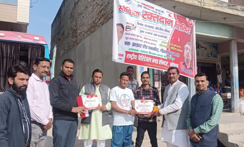 दनकौर :आज रविवार को किसान एकता संघ की तरफ से स्वैच्छिक रक्तदान शिविर का आयोजन राष्ट्रीय अध्यक्ष चौधरी सोरन प्रधान जी के सौजन्य से उनके आवास झाझर रोड दनकौर पर किया गया।चौ सोरन प्रधान जी ने कहा कतरा कतरा खून का जीवन का रसधार , खून अपना देकर करो प्राणों का संचार। हर व्यक्ति को रक्तदान अवश्य करना चाहिए रक्तदान जीवनदान है।