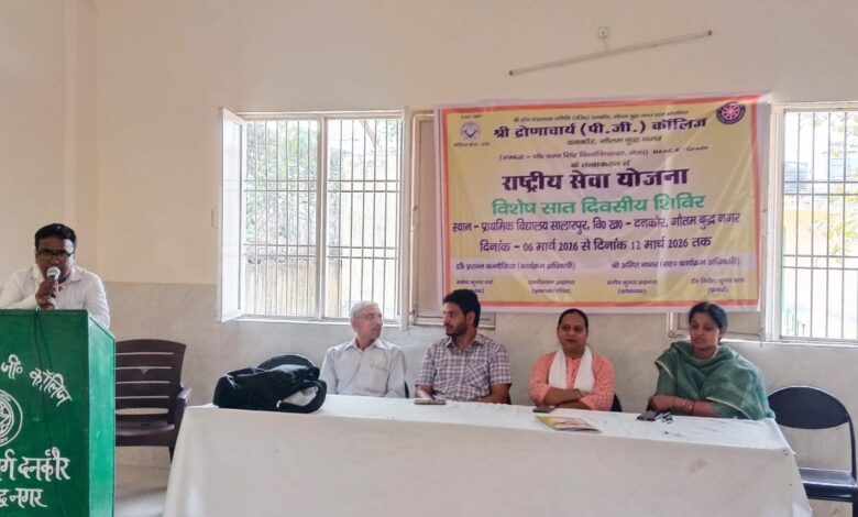 दनकौर (गौतम बुद्ध नगर)आज श्री द्रोणाचार्य पी.जी. कॉलेज, दनकौर की राष्ट्रीय सेवा योजना (एन.एस.एस.) इकाई द्वारा आयोजित सात दिवसीय विशेष शिविर के पंचम दिवस का कार्यक्रम ग्राम सलारपुर स्थित प्राथमिक विद्यालय, विकासखंड दनकौर में अत्यंत उत्साह एवं सामाजिक जागरूकता के वातावरण में संपन्न हुआ। यह शिविर महाविद्यालय के सचिव एवं प्रबंधक श्री रजनीकांत अग्रवाल तथा प्राचार्य डॉ. गिरीश कुमार वत्स के संरक्षण में तथा कार्यक्रम अधिकारी डॉ. प्रशांत कनौजिया एवं सहायक कार्यक्रम अधिकारी श्री अमित नागर के निर्देशन में संचालित किया जा रहा है।