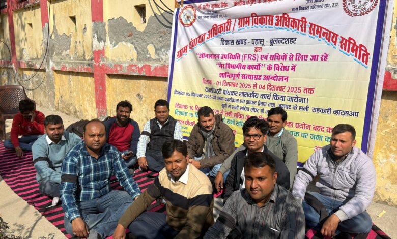 पहासू (बुलंदशहर) ग्राम पंचायत अधिकारी/ग्राम विकास अधिकारी समन्वय समिति, विकास खण्ड पहासू ने ऑनलाइन उपस्थिति (FRS) प्रणाली और सचिवों से कराए जा रहे गैर विभागीय कार्यों के विरोध में चरणबद्ध आंदोलन की शुरुआत कर दी है। समिति के आह्वान पर 01 दिसम्बर 2025 से 04 दिसम्बर 2025 तक सभी सचिव काली पट्टी बांधकर शासकीय कार्य करेंगे। समिति द्वारा जारी कार्यक्रम के अनुसार 05 दिसम्बर 2025 को सचिव धरना देंगे और ज्ञापन प्रेषित करेंगे। इसी दिन जनपद के सभी सहकारी व्हाट्सएप समूहों से सभी सचिव सामूहिक रूप से बाहर हो जाएंगे। आंदोलन के अगले चरण में 10 दिसम्बर 2025 से सचिव निजी वाहन का प्रयोग बंद करेंगे, जबकि 15 दिसम्बर 2025 को अपने-अपने डोंगल ब्लॉक मुख्यालय पर जमा करेंगे। इस मौके पर अभिलाष कुमार, मोनू कुमार, पम्मी सिंह, अभिमन्यु पांडेय, नितिन कुमार, मोहित भूषण, कृष्णपाल सिंह, निपेंद्र कुमार, विपुल शर्मा, लाखन सिंह, दीपक सिंह, विनोद कुमार और आज़ाद शाह सहित सभी सचिव उपस्थित रहे।