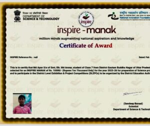 इसी क्रम में विद्यालय के कक्षा 7 के छात्र मोहम्मद अयान का चयन वर्ष 2025-26 के “ इन्सपायर मानक अवार्ड” के लिए हुआ है। यह उपलब्धि उनकी वैज्ञानिक सोच एवं नवाचार क्षमता का परिचायक मानी जा रही है।