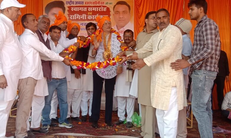बिलासपुर: ग्रेटर नोएडा दनकौर क्षेत्र के नवादा गांव मे बजरंग वाहिनी दल के प्रदेश अध्यक्ष मनोज कुमार नागर की अध्यक्षता व नीरज सरपंच के संचालन में बजरंग वाहिनी दल द्वारा मुख्य अतिथि राष्ट्रीय अध्यक्ष गजराज सिंह के सम्मान में आयोजित स्वागत समारोह एवं रागिनी कार्यक्रम में बजरंग वाहिनी दल के प्रदेश के विभिन्न जनपदों एवं प्रान्तों से सैकड़ों की तादाद में कार्यकर्ता पदाधिकारी एवं किसान नेता पहुंचे जिनके सर पर साफा गले में माला पहना कर स्वागत सत्कार किया गया। विशिष्ट तिथि अजीत सिंह दौला, संयोजक बालकिशन नागर, संजय नवादा, राजसिंह प्रधान आदि ने मुख्य अतिथि संगठन के राष्ट्रीय अध्यक्ष गजराज सिंह को बुका व तलवार भेंट कर जोरदार अभिनंदन किया।