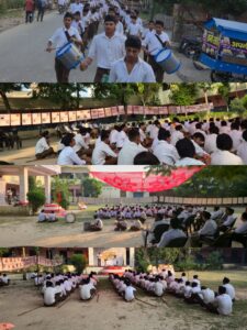 आरएसएस द्वारा पुष्प वर्षा के बीच देशभक्ति की मधुर धुनों के साथ अनुशासित पथ संचलन निकाला जिसमें सैकड़ों की संख्या में स्वयंसेवकों ने भाग लिया, जो विद्या मंदिर इंटर कलेज से शुरू होकर कस्बे के प्रमुख मार्गों बड़ा मोहल्ला, नई बस्ती ,दीनदयाल चौराहा , टीन का बाजार ,पीर वाला मोहल्ला, लंबा गलियारा, और बिहारी लाल चौराहा से होते हुए वापस कॉलेज पहुंचा। कस्बे वासियों ने जगह-जगह पुष्प वर्षा कर स्वयंसेवकों का स्वागत किया।