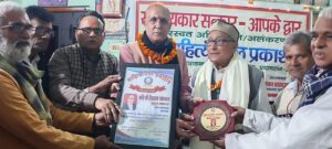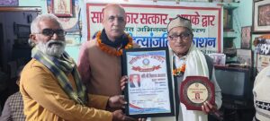 प्रयागराज : साहित्यांजलि प्रकाशन प्रयागराज के तत्वावधान में विगत एक वर्ष से चल रही सम्मान श्रृंखला साहित्यकार सत्कार आपके द्वार को आज एक वर्ष पूरा हो गया । इस अवसर पर शिवराम उपाध्याय मुकुल मतवाला को साहित्य रत्न सम्मान से सम्मानित किया गया।