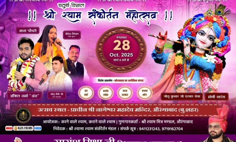 औरंगाबाद (बुलंदशहर )जन जन के आराध्य खाटूश्यामजी के जन्मदिन के उपलक्ष्य में श्री श्याम मित्र मंडल के तत्वावधान में प्राचीन नागेश्वर मंदिर परिसर स्थित रामलीला मैदान में 28 अक्टूबर दिन मंगलवार को चतुर्थ श्याम संकीर्तन महोत्सव मनाया जायेगा। कार्यक्रम के सह आयोजक श्री श्यामा श्याम संकीर्तन मंडल के सदस्य होंगे।