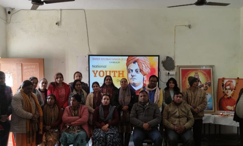 दनकौर: श्री द्रोणाचार्य (पी0जी0) काॅलेज, दनकौर में महान चिन्तक, दार्शनिक एवं युवाओं के प्रेरणास्रोत स्वामी विवेकानन्द जी की जयंती तथा राष्ट्रीय युवा दिवस के अवसर पर एक प्रेरणादायी कार्यक्रम का आयोजन किया गया।