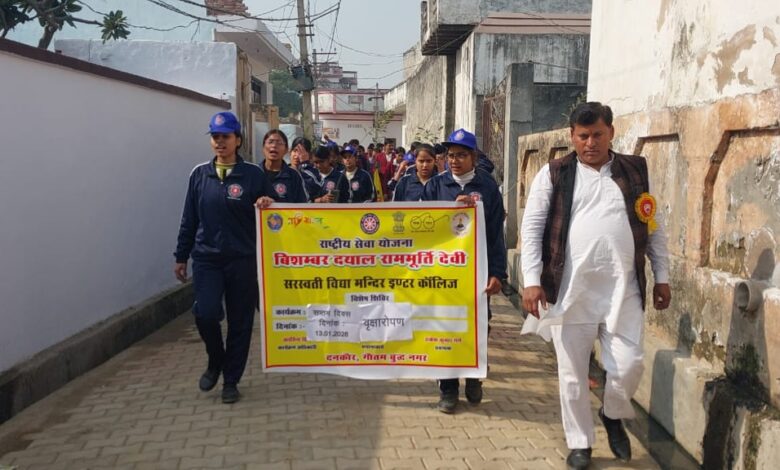 दनकौर: आज अखिल भारतीय शिक्षा संस्थान से संबद्ध बिशम्बर दयाल राममूर्ति देवी सरस्वती विद्या मंदिर इंटर कॉलेज दनकौर,गौतमबुद्धनगर की राष्ट्रीय सेवा योजना इकाई के प्राथमिक विद्यालय मोहम्मदपुर गाँव में सात दिवसीय विशेष शिविर का सप्तम दिवस का प्रारंभ हुआ। शिविर के प्रथम सत्र का शुभारंभ मुख्य अतिथि श्री हरेंद्र भाटी,(नोडल अधिकारी राष्ट्रीय सेवा योजना),श्री जयवीर सिंह जी,श्री चाहतराम जी, श्रीमती सरोज खारी जी,श्री नेपाल जी, विद्यालय के प्रधानाचार्य श्री जयप्रकाश सिंह जी,आचार्य श्री पवन जी, श्री राकेश चौहान जी, श्रीमती भावना शर्मा जी,श्री हरिओम शर्मा जी व कार्यक्रम अधिकारी श्री अरविंद सिंह जी ने संयुक्त रूप से मां शारदे के समक्ष दीप प्रज्वलन व पुष्पार्चन करके किया।