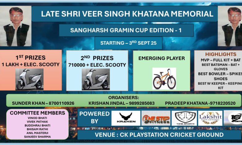 स्वर्गीय श्री वीर सिंह खटाना मैमोरियल ग्रामीण टूर्नामेंट 3 सितंबर से